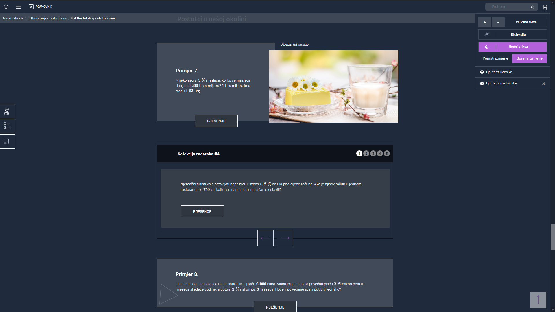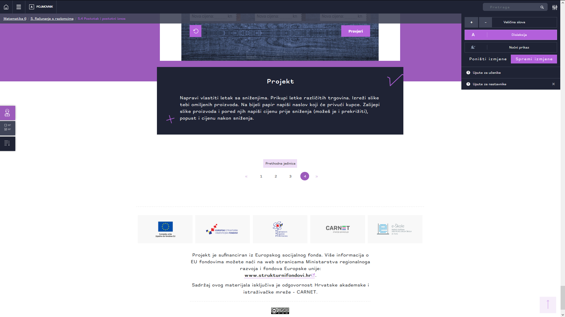 Izbornik za pristupačnost omogućuje promjenu veličine slova na stranicama sadržaja, uključivanje i isključivanje fonta za disleksiju te uključivanje i isključivanje noćnog prikaza.