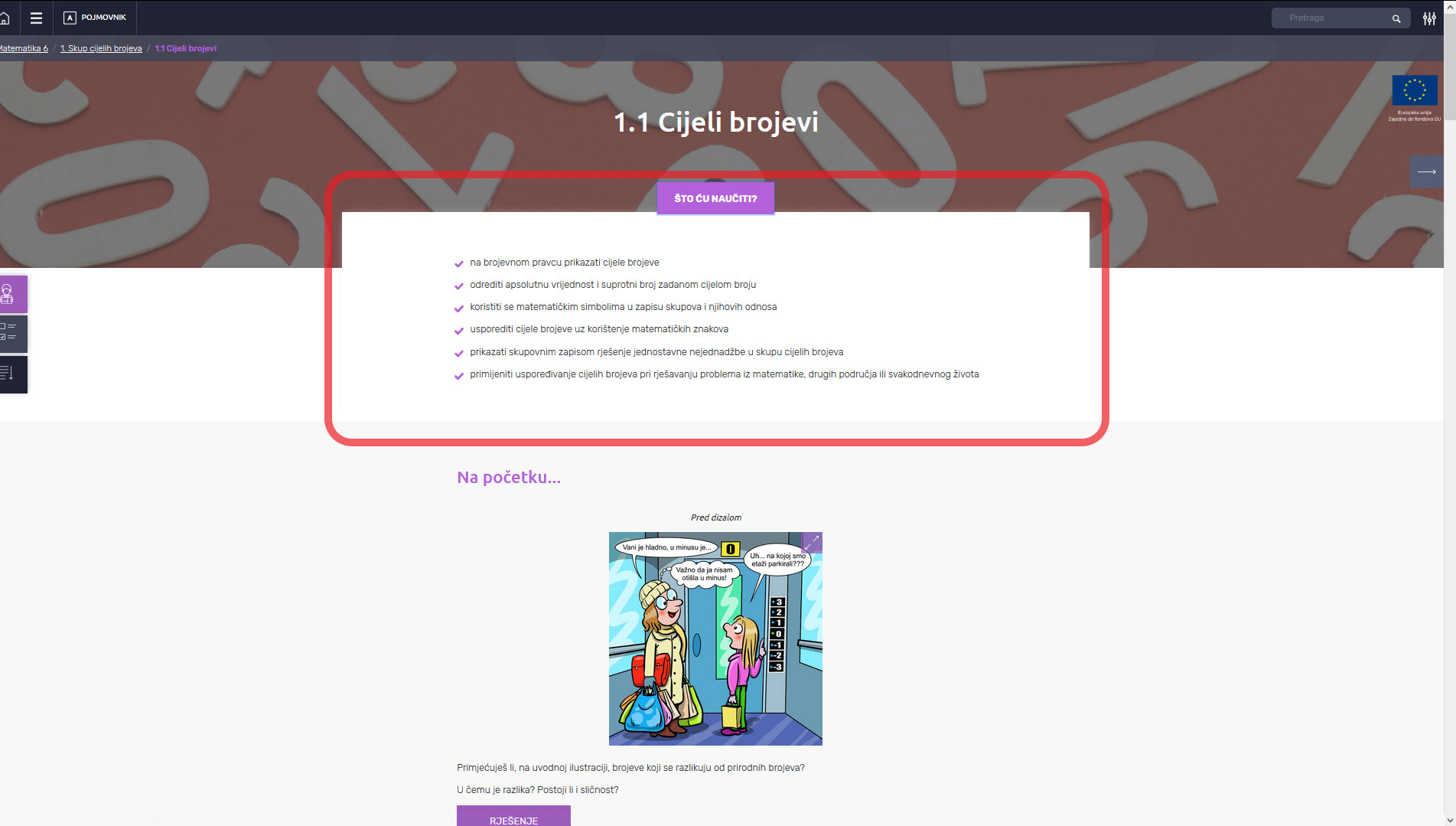 Na vrhu svake stranice u strukturi sadržaja, bez obzira na to radi li se o cijelom digitalnom sadržaju za pojedini razred, modulu ili jedinici, nalazi se gumb „Što ću naučiti“ gdje se nalazi popis obrazovnih ishoda za taj digitalni obrazovni sadržaj, modul ili jedinicu.