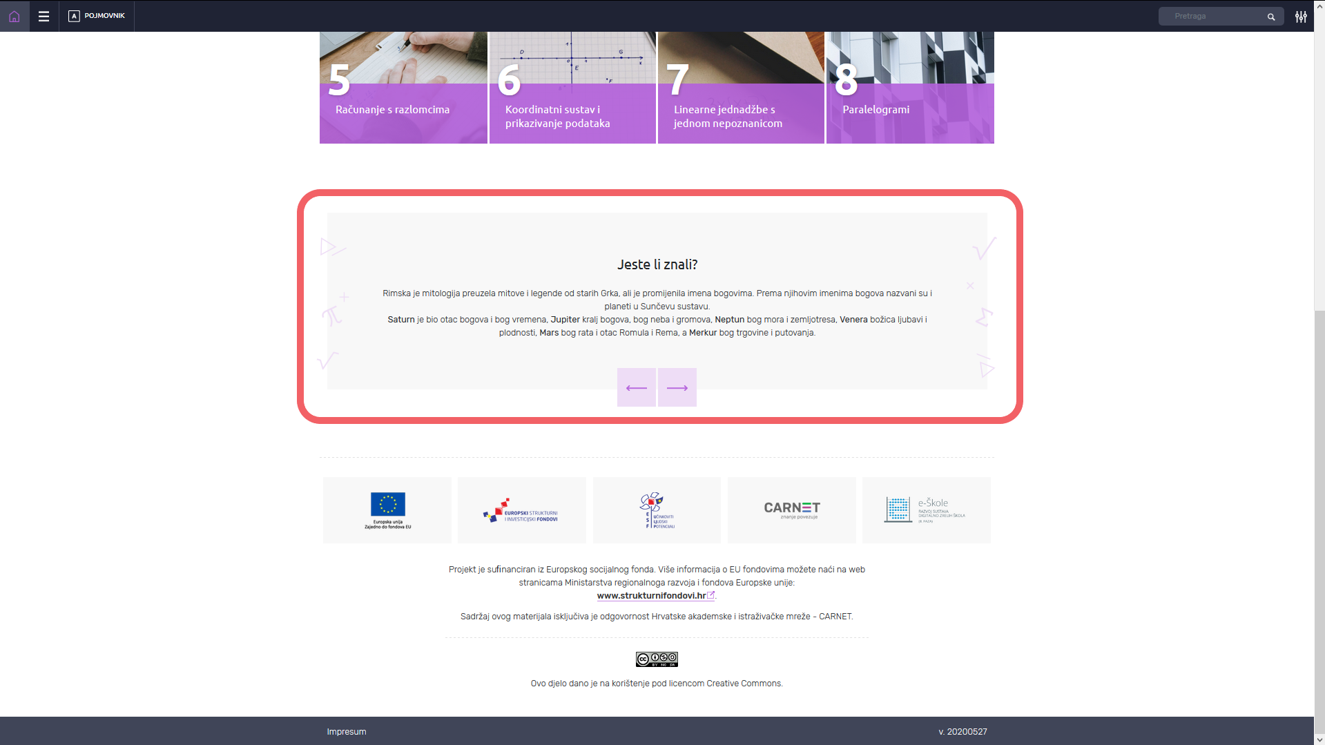 Osim popisa modula, odnosno jedinica, na dnu naslovnica digitalnog obrazovnog sadržaja i modula, prikazuju se zanimljivosti koje su vezane uz teme tog sadržaja ili modula.