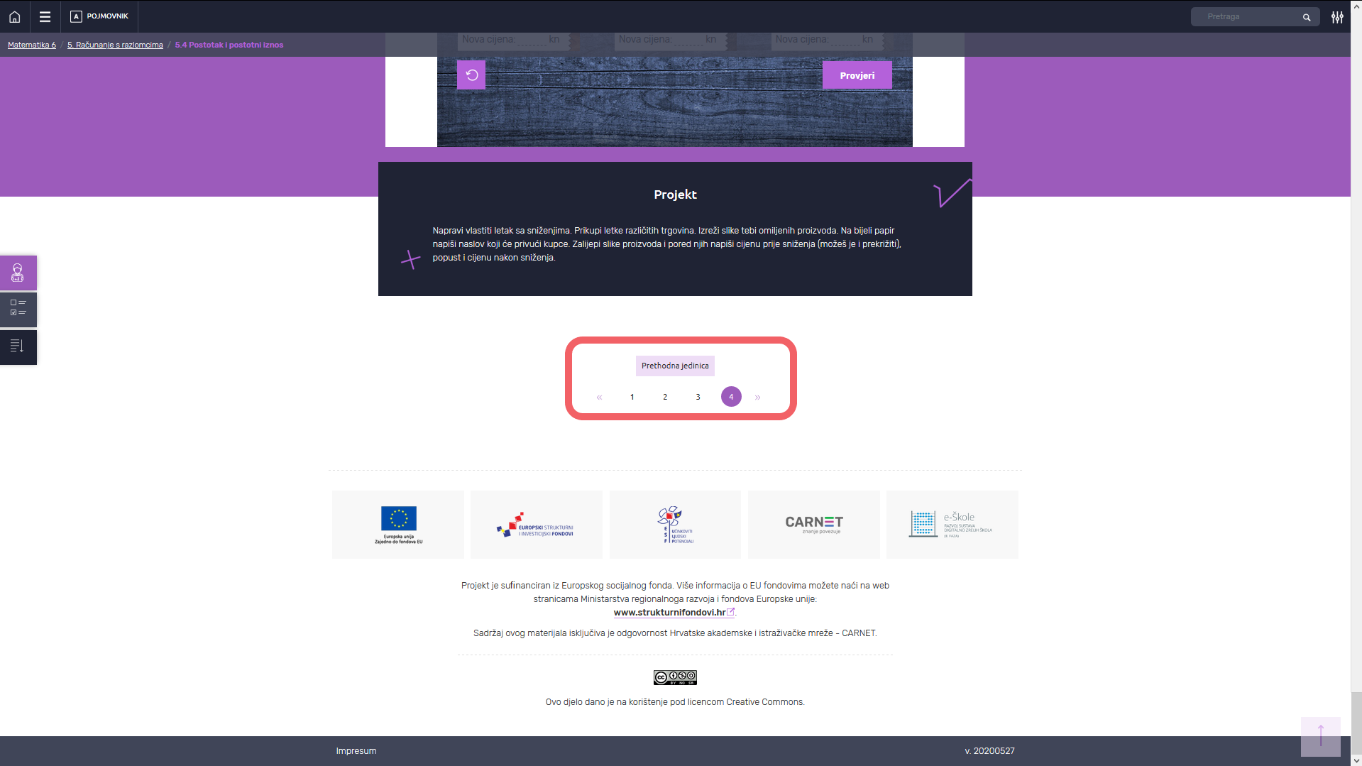 Kada se nalazimo na stranici pojedine jedinice, možemo prelaziti na prethodnu ili sljedeću jedinicu pomoću strelica u zaglavlju stranice. Pristup do svih jedinica u modulu omogućen je uz pomoć odabira rednog broja pojedine jedinice i direktnog pristupa prvoj i zadnjoj jedinici.