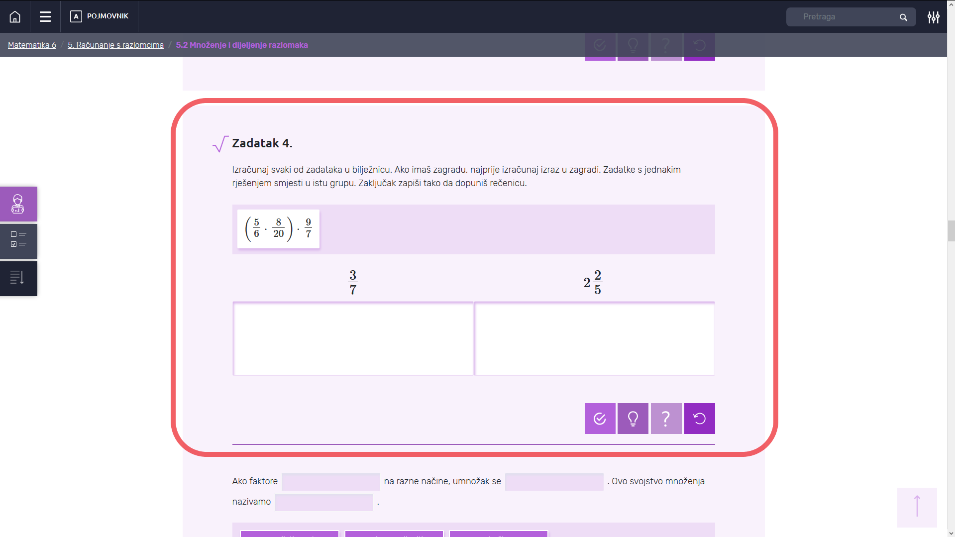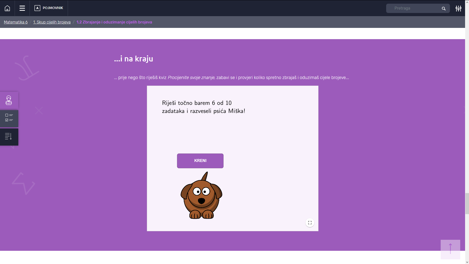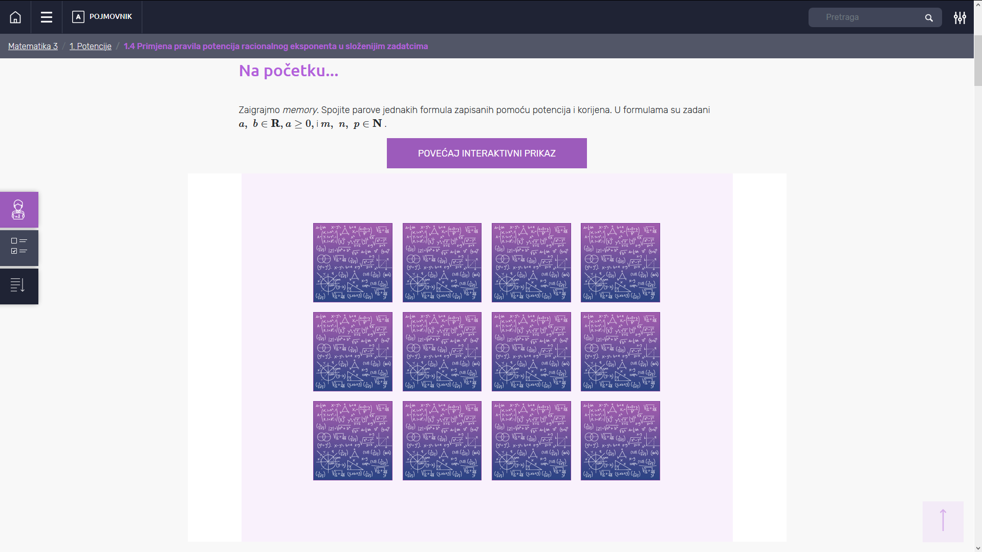 Postoje i neke složenije interaktivne vježbe i zadatke. Sadrže različite interaktivne igre, slagalice i slično. Iznad takvih vježbi nalazi se gumb kojim učenik može povećati takvu vježbu na pun ekran kako bi korištenje vježbe bilo što lakše, preglednije i ugodnije.